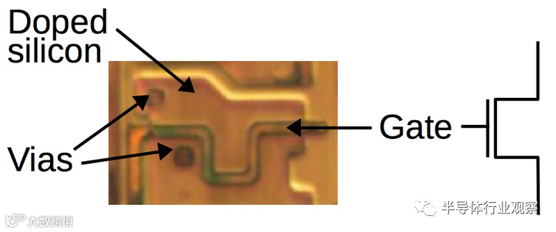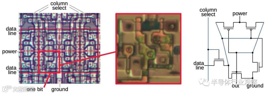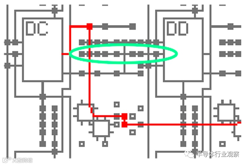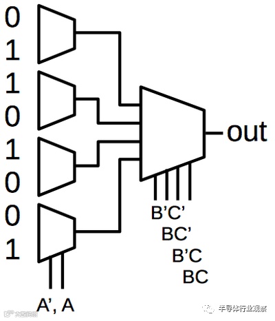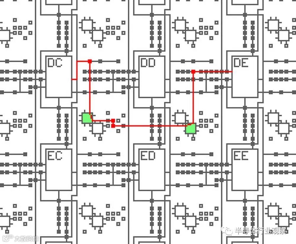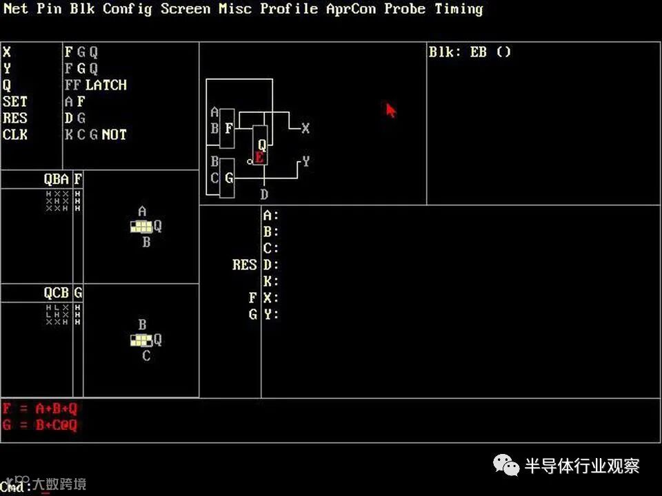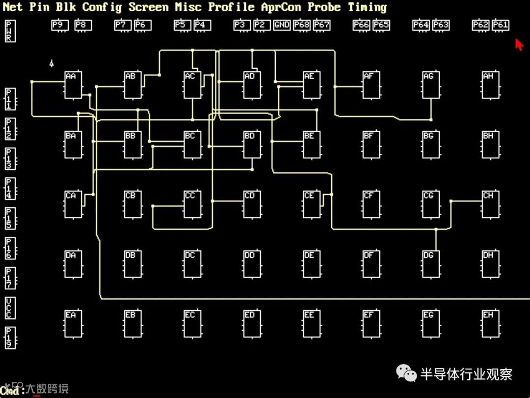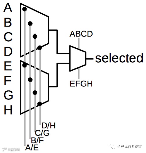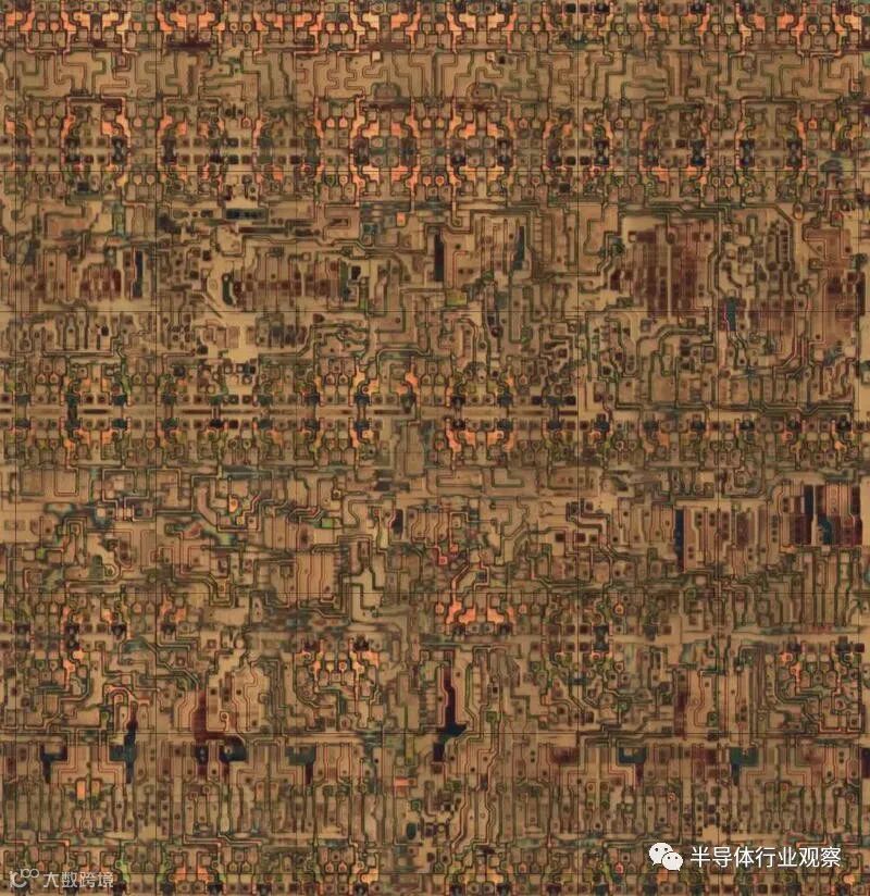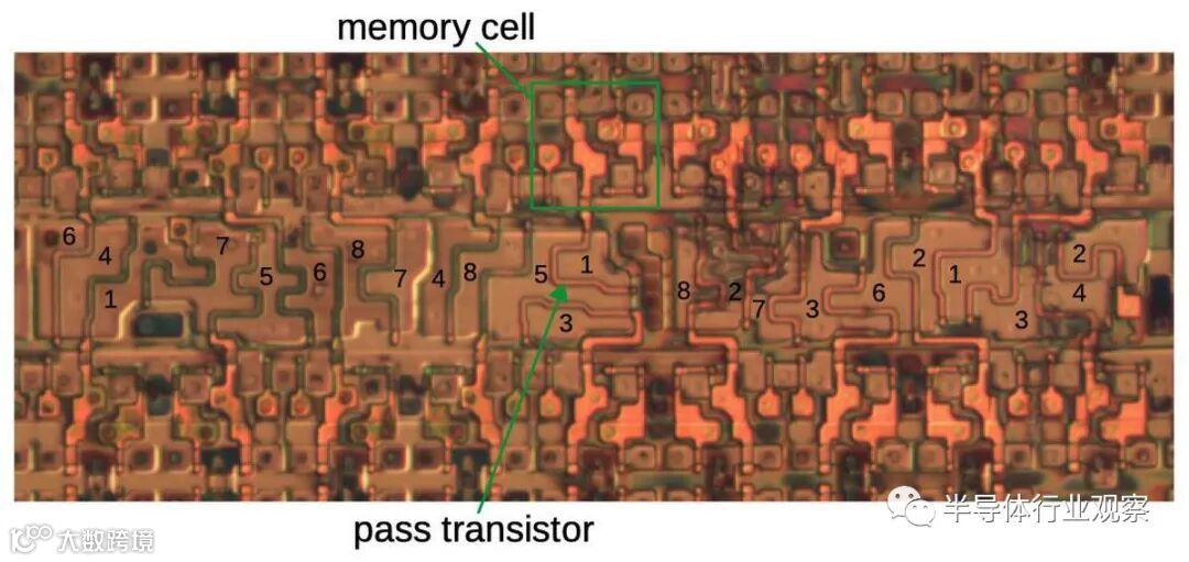 这篇文章的其余部分讨论了XC2064的内部电路,这些照片是根据照片进行反向工程的。 下图显示了XC2064芯片的布局。FPGA的主要部分是8×8的网格。每个图块包含一个逻辑块和相邻的路由电路。尽管FPGA图将逻辑块(CLB)显示为与围绕它们的路由不同的实体,但这并不是FPGA的实现方式。取而代之的是,每个逻辑块和相邻路由都实现为单个实体,即图块。(具体来说,图块包括每个CLB上方和左侧的路由。) I / O模块围绕集成电路的边缘提供与外界的通信。它们连接到小的绿色方形焊盘,该焊盘连接到芯片的外部引脚。die被缓冲区(绿色)划分:两个垂直和两个水平。这些缓冲器可放大在电路中传播很长距离的信号,从而减少延迟。垂直移位寄存器(粉红色)和水平列选择电路(蓝色)用于将位流加载到芯片中,如下所述。