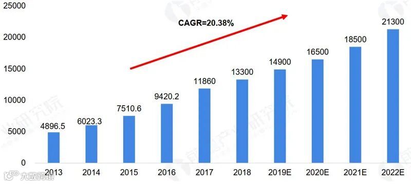 ▲2013-2022中国物联网行业市场规模(单位:亿元,%)
