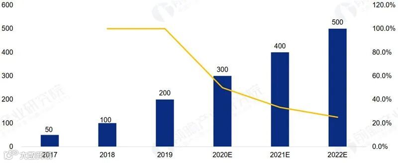 ▲2017-2022中国车联网行业市场规模及预测(单位:亿美元,%)