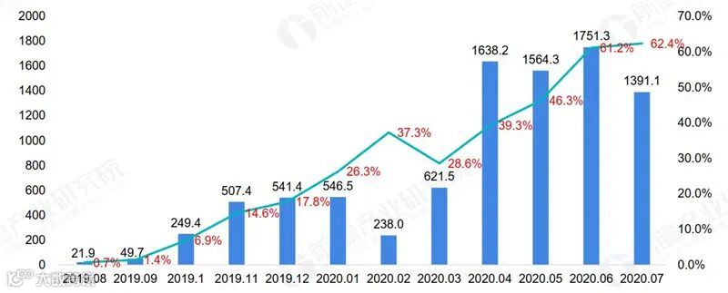 ▲2019-2020年中国5G手机出货量及比重月度走势(单位:万部,%)