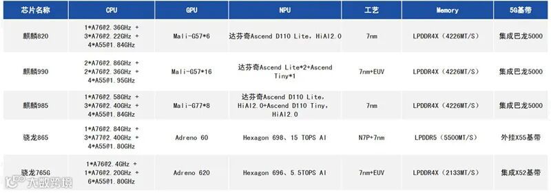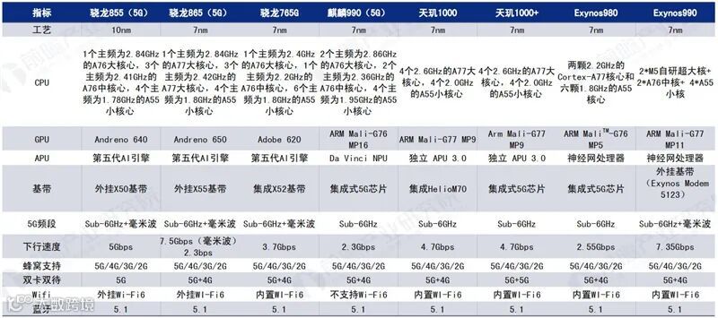 ▲主流5G手机AP芯片性能参数