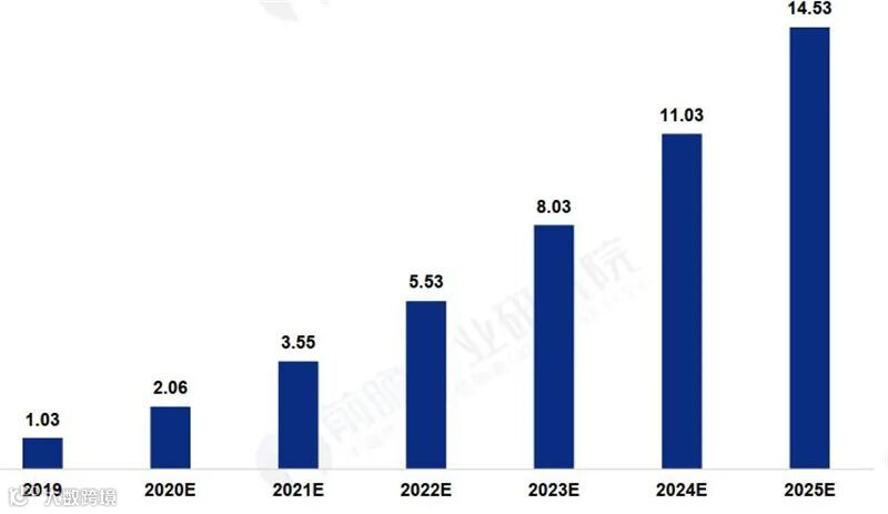 ▲2019-2025年全球5G芯片市场规模及预测(单位:十亿美元)