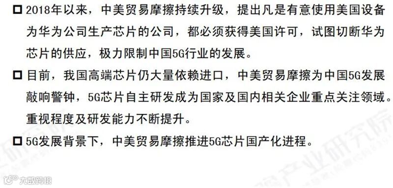 目前,我国高端芯片多依赖进口,2018年以来中美贸易摩擦持续升级,美国通过切断核心领域5G芯片的供应,遏制中国5G行业的发展,为5G芯片国产化的发展敲响警钟,推动芯片国产化进程 。