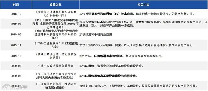 从2017年政府工作报告首次提到“5G”,再到2019年5G应用从移动互联网走向工业互联网,进入商用元年,国家政策对5G的重视度不断上升。2020年是5G发展的关键年份,中央政治局会议、国务院常务会议、中央政治局常务会等会议和相关文件多次强调“加快5G商用步伐”,充分体现了5G基建对于拉动新基建和经济增长的重要性和紧迫性。