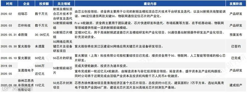 5G商用化的发展激发了对5G芯片核心部件的需求,在技术快速推进的同时,也获得了资本的高度重视。5G芯片代表性企业紫光展锐与2020年5月10日进行股权项目,增资50亿元,用于5G、物联网、人工智能等领域的核心芯片研发。而2020年初5G芯片其他企业获得融资的关注领域看,主要集中在5G射频芯片模组等领域。