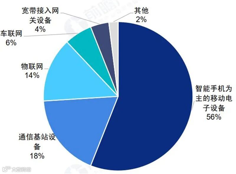 根据Grand View Research的数据,2019年,以智能手机为主的移动电子设备占据了5G芯片市场规模56%的份额;其次为5G基站设备,受益于5G基础网络设施的持续投资,目前占据了18%的市场份额;物联网领域占据了14%的市场份额;车联网领域占据了6%的市场份额。