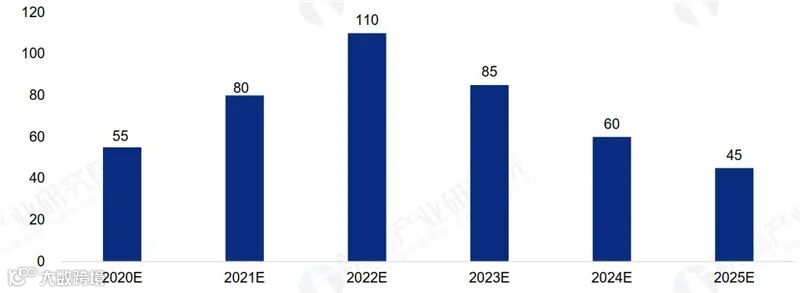 ▲2020-2025年中国新建5G基站数量预测(单位:万个)