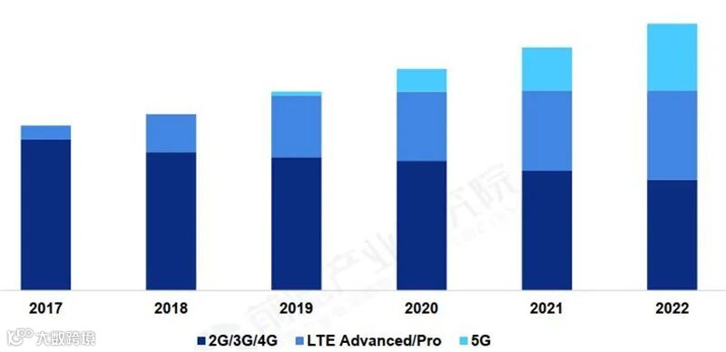 ▲2017-2022年全球4G、5G射频前端芯片年产值及预测(单位:亿美元)
