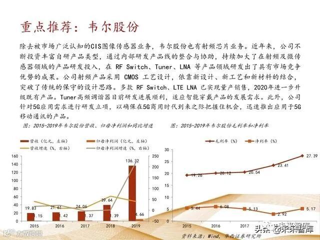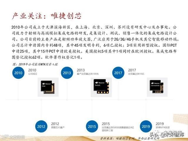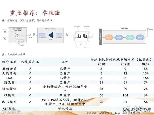 国内射频芯片厂商从相对成熟的分 立射频芯片起步,在5G手机广泛普及前的窗口期,逐步实现中低端机型 射频前端进口替代,同时积累模组能力,逐步走向全品类供应。国内已 经出现以卓胜微为代表的射频龙头公司,从射频开关、LNA芯片起家, 实现全球领先手机品牌如三星、小米、华为、vivo、OPPO等重点客户覆 盖,并在2019年实现射频模组产品从无到有的突破,未来有望逐步成为 全球射频芯片龙头。
