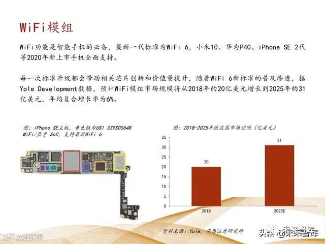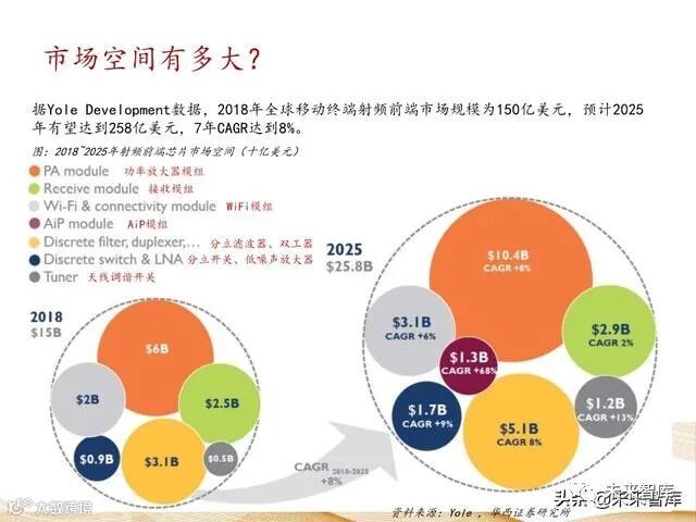 凡是接入移动互联网的设备均需要射频前 端芯片,随着联网设备数量持续增加,射频芯片市场持续增长。据Yole 数据,2018年全球移动终端射频前端市场规模为150亿美元,预计2025 年有望达到258亿美元,7年CAGR达到8%。