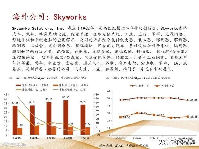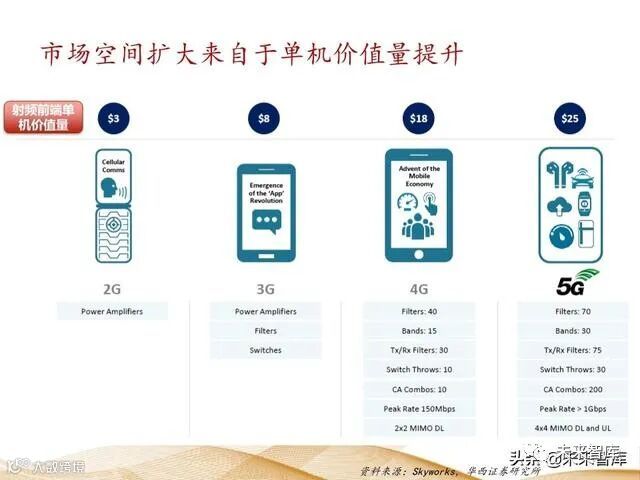 每一次通信制式升级,都是射频芯片价值量 提升的机遇。5G手机必然要兼顾2/3/4G,因此5G手机在保留2/3/4G射频 芯片的同时,支持5G新频段的射频芯片为全新增量。据Skyworks数据, 2G手机射频前端芯片价值量为3美元,3G手机上升到8美元,高端4G手机 为18美元,而5G手机射频芯片价值量达到25~30美元。