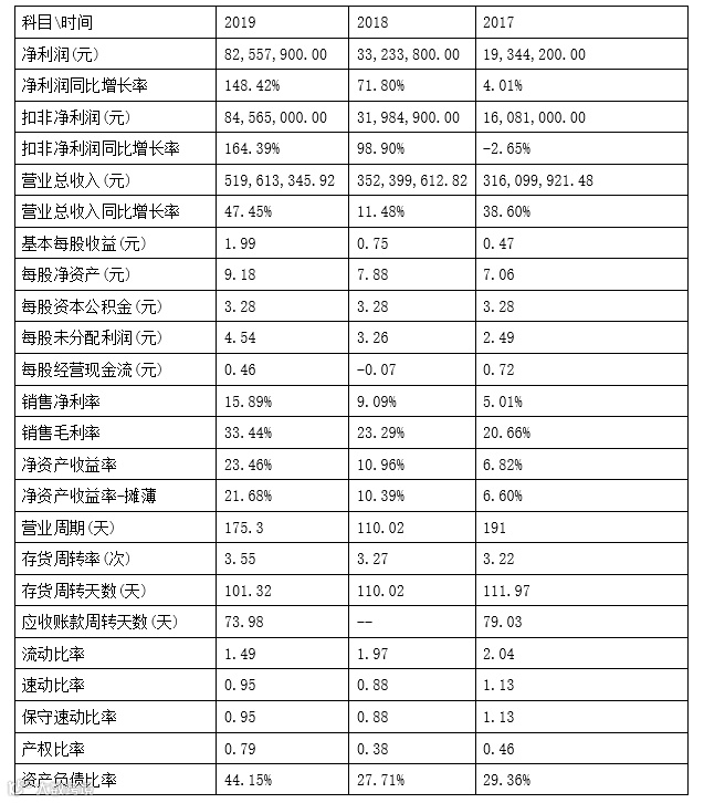 2019年公司通过技术创新与改进,不断提升产品的竞争力。同时结合市场的变化,适时调整销售策略与销售方式。全年完成营业收入519,613,345.92元,同比上升47.45%;归属于挂牌