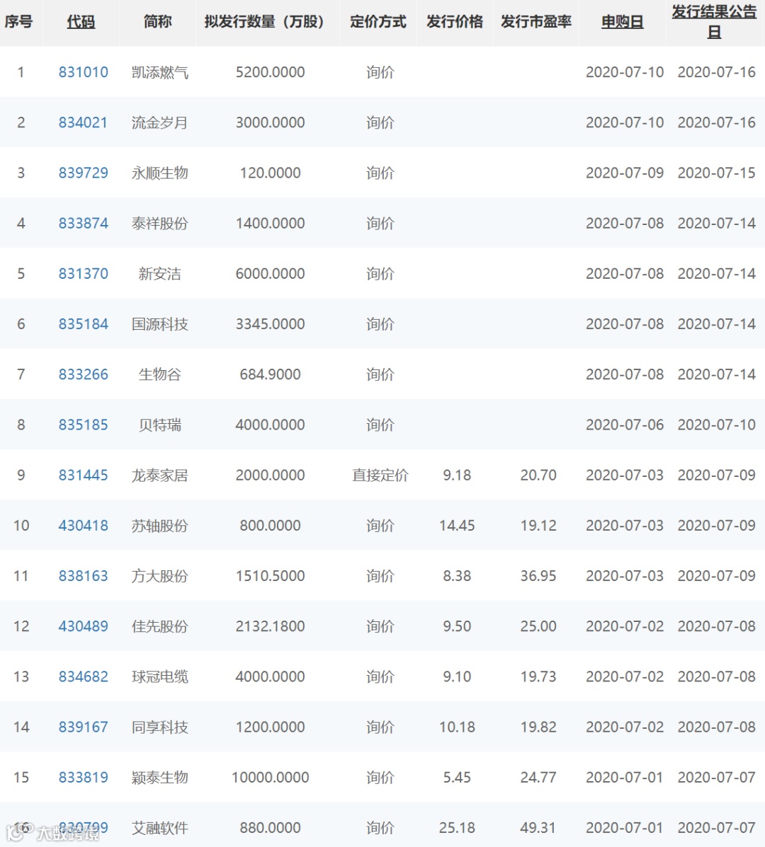 事实上,接下来至7月10日,都将会有密集申购的机会,其中同享科技、球冠电缆、佳先股份将在7月2日开启申购;方大股份、苏轴股份、龙泰家居则于7月3日申购。统计显示,7月2日至10日,还将有14家公司进行公开发行,除了上述6家外,还有贝特瑞、生物谷、国源科技、新安洁、泰祥股份、永顺生物、流金岁月和凯添燃气8家陆续登场。
