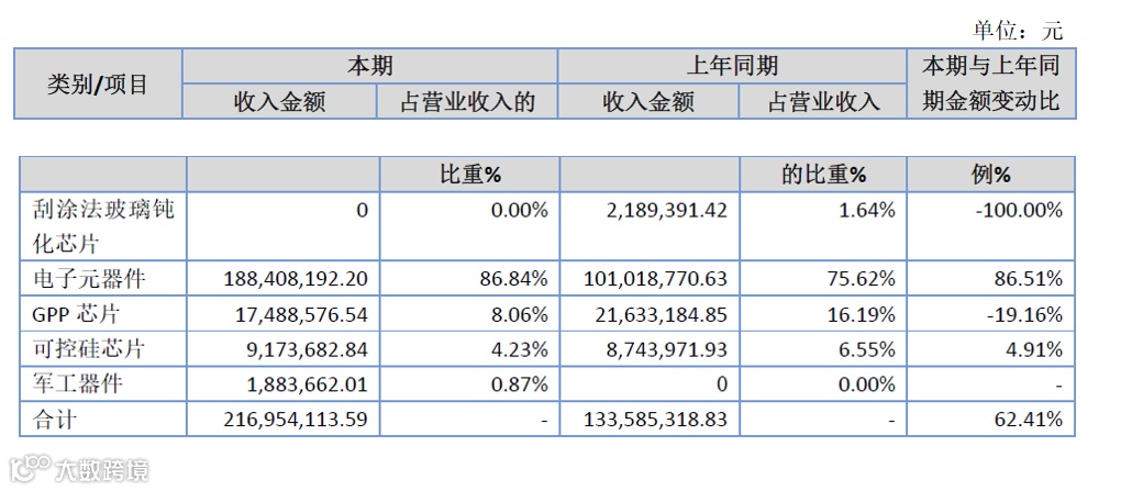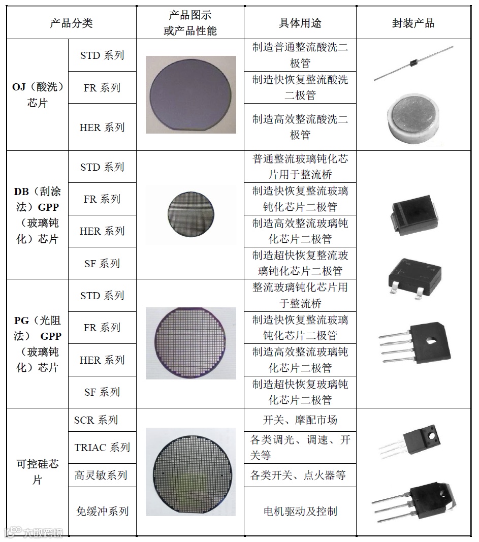 公司的主要产品为半导体分立器件芯片,是指在半导体片材上进行扩散、光刻、蚀刻、清洗、钝化、金属化等多道工艺加工,制成的能实现某种功能的半导体器件,包括酸洗芯片、玻璃钝化芯片及可控硅芯片。公司半导体万级净化厂房达4,000平方米,采用行业先进的生产工艺,特别是GPP钝化芯片LPCVD设备,年产GPP类玻璃钝化芯片300万片,产品品质可靠性更佳。