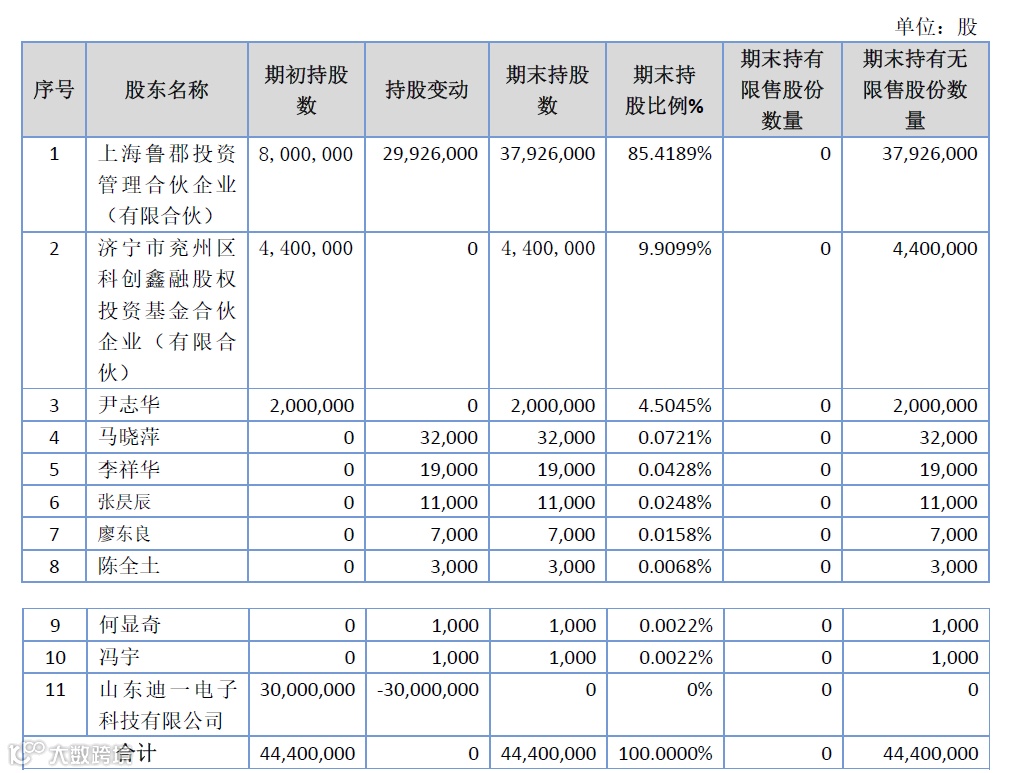 山东迪一电子科技有限公司、鲁郡投资是实际控制人陈钢全控制的企业和机构,陈钢全与陈广芝是山东迪一电子科技有限公司的股东,陈钢全和陈广芝为配偶关系,尹志华与陈勇系配偶关系,陈钢全和陈勇为堂兄弟。除此之外,公司股东之间无其他关联关系。
