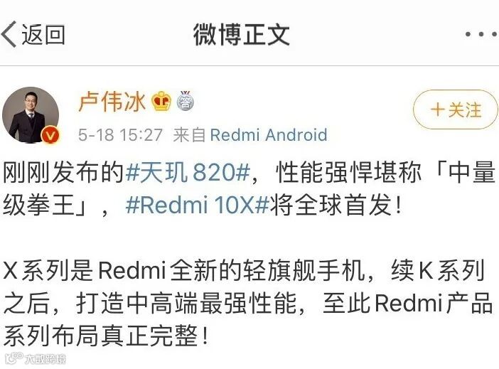 5月18日,小米集团副总裁卢伟冰在其新浪微博盛赞联发科天玑820芯片为“中量级拳王”,并宣布Redmi10x将全球首发天玑820。