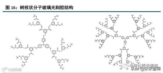 分子玻璃是一种具有较高玻璃态转变温度的小分子有机化合物,集聚合物与小分子的优点于一身。常见的 分子玻璃类化合物包括支化型,四面体型,树枝状型、杯芳烃、富勒烯、多元酚和聚噻吩等。从分子结构来看, 分子玻璃光刻胶与 OLED 材料具备诸多的相似之处。