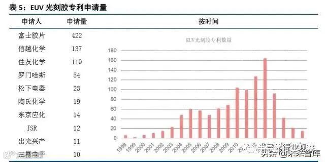 从专利数量来看, 2000 年之后 EUV 光刻胶的专利申请量快速增长,并在 2010 年之后迎来井喷式爆发, 2013 年以后专利申请量逐步减少,一方面由于技术发展逐步成熟,另一方面源于统计误差(较新的专利可能未公布)。从专利申请量来看,富士胶片、信越化学、住友化学 3 家日本龙头公司合计申请了行业 80%以上的专利。