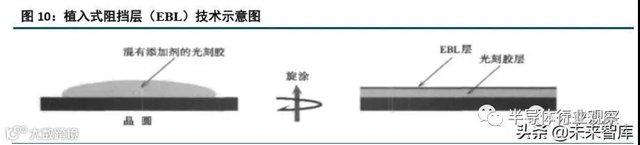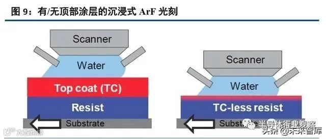 沉浸式 ArF 光刻技术使用了液体介质,虽然提高了光刻分辨率,但也对光刻胶提出了更高的要求。沉浸式 ArF 光刻胶的开发重点之一就是要解决光致产酸剂和其他组分在液体中的浸出。因此工艺开发主要在于两方面, 一个是顶部涂层(Top coat, TC)材料的设计,另一个是防光致产酸剂浸出的光刻胶材料开发。早期的沉浸式光 刻研究中,使用的仍是干式光刻技术的光刻胶,主要通过增加一层顶部涂层来解决工艺方面的问题。科学家开 发了植入式阻挡层(Embedded barrier layer, EBL)技术,通过添加特种表面活性剂,在旋涂过程中扩散到光刻 胶表面形成 EBL 层,防止光刻胶成分的浸出。