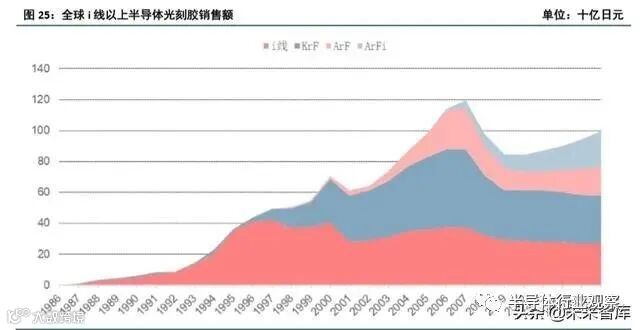 事实上,IBM 在 1980s 早期就突破了 KrF 光刻,并在 1980s 早期至 1995 年的十余年时间一直保持垄断地 位。但在此期间,KrF 光刻胶的市场增速缓慢,并未大规模放量,我们认为主要由于 1980s-1995 年,半导体工 艺节点主要集中在 1.5μm-0.35μm,这一范围的工艺可以用 i 线光刻实现,从而使 KrF 光刻成为了“早产儿”,半 导体工业的发展尚未到达需要 KrF 光刻大规模放量的时代。1995 年日本东京应化(TOK)成功突破了高分辨率 KrF 正性光刻胶 TDUR-P007/009 并实现了商业化销售,打破了 IBM 对于 KrF 光刻胶的垄断,而与此同时,半 导体工艺节点发展到了 0.25-0.35μm,逼近了 i 线(365nm 波长,已经与特征尺寸 0.35μm=350nm 接近)光刻的 极限。此外,光刻机市场也由此前美国厂商主导逐步演变为佳能、尼康为龙头的时代。天时地利俱备的情况下, 日本 KrF 光刻胶迅速放量占据市场,光刻胶市场也正式进入了日本厂商的霸主时代。