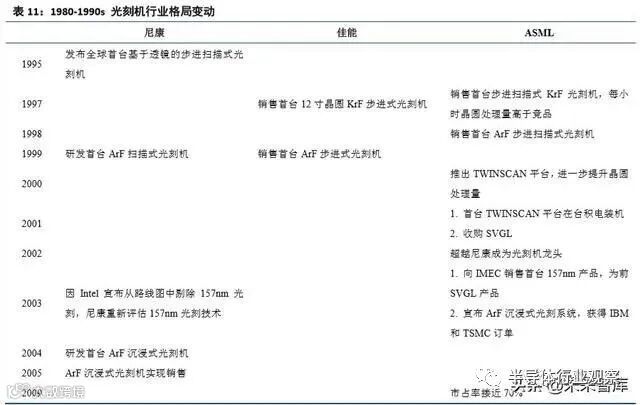 实际上从半导体产业链的第二次转移开始,日本的半导体产业就已经呈现持续流出的态势。与此同时,日 本光刻机产业辉煌,只持续了 10 余年时间。2000 年,荷兰 ASML 推出了 TWINSCAN 平台,显著提升了光刻 机的晶圆处理效率,并于 2001 年在台积电实现首次装机,同年 ASML 实现了对 SVGL 的收购。2002 年,ASML 超越尼康坐上了光刻机市场的头把交椅。