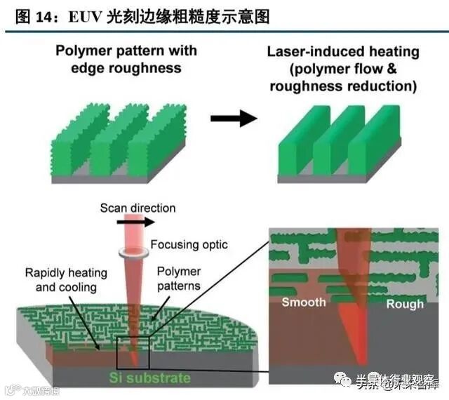 随着线宽的不断减小,EUV 光刻胶必面临 RLS(分辨率、边缘粗糙度、灵敏度)的挑战,即在光刻胶的分 辨率、边缘粗糙度(LER)和光敏性 3 者之间只能实现 2 个参数的最优化,随着线宽的不断减小,LER 对图形的影响越来越大。