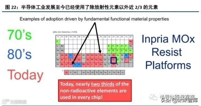 挑战:①当前我国仅北京科华实现了 KrF 光刻胶的量产,而 IBM 早在 1980s 就已攻克此技术,我国技术水 平落后近 40 年;② 我国不论在光刻胶下游的 IC 制造还是与其搭配的光刻机方面,均与全球顶尖水平存在差距;③我国光刻胶当前仍处于追赶阶段,需要等待技术迭代中实现弯道超车的契机,而半导体行业在历史上已经发 生过数次技术路线选择错误导致龙头厂商衰落的情况下,现有龙头厂商对下一代技术往往极为重视,布局非常 全面,以金属氧化物光刻胶为例,龙头厂商 Inpria 获得了三星创投、JSR、Intel Capital、SK 海力士、台积电、法 液空、东京应化等半导体及材料龙头厂商的投资,这种情况下,国内半导体厂商想再次通过技术路线的选择, 实现对传统龙头的降维打击,可谓难上加难。
