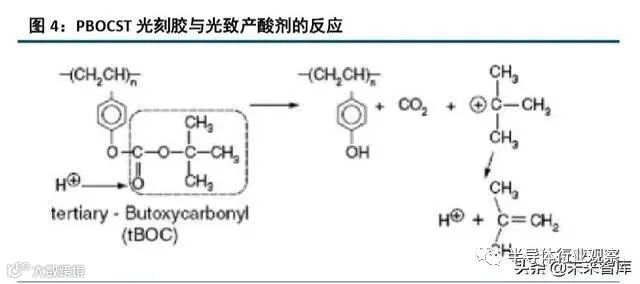 IBM 公司的科学家们在研究 64K DRAM 的生产工具时,领导了对化学放大光刻胶的研发。Ito 和 Willson 等人以聚 4-羟基苯乙烯(PHOST)作为树脂材料,并且加入 t-丁氧基羰基(t-BOC)保护羟基,这一新的聚合 物就是 PBOCST。PBOCST 光刻胶暴露在 248nm 深紫外光下时,PAG 产生的酸会打开 t-BOC 保护基团,光刻胶 溶解性发生显著变化。打开 t-BOC 的过程中,PAG 产生的酸并不会被消耗,因此 PBOCST 光刻胶反应速度极快, 对深紫外光非常敏感,灵敏度提高了 100-200 倍。PBOCST 光刻胶为 IBM 节省了用来修改和替换光刻工具的数 百万美元。