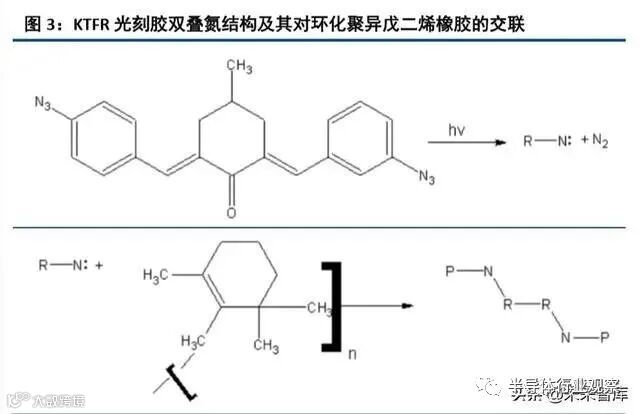1950s 贝尔实验室尝试开发全球首块集成电路的过程中,理所当然地采用了重铬酸盐明胶体系,半导体光 刻胶由此诞生。对于当时的初代光刻工艺来说,重铬酸盐明胶的分辨率已足够,但抗蚀性能不佳,无法充分阻 止氢氟酸对二氧化硅的刻蚀。为解决这一问题,贝尔实验室找到伊士曼柯达公司,后者首先开发了聚肉桂酸乙 烯酯体系,其产品以 KPR 商品名称来供应市场。但该材料对二氧化硅的附着力不足;柯达转而寻找具备强附着 力的材料,并最终开发出环化橡胶-双叠氮体系:该体系由环化聚异戊二烯橡胶与双叠氮 2,6-二(4-叠氮苯)-4-甲 基环己酮混合而成,柯达将此光刻胶命名为 Kodak Thin Film Resist(柯达薄膜抗蚀剂),也即 KTFR 光刻胶。该体系在 1957-1972 年间一直为半导体工业的主力体系,为半导体工业的发展立下了汗马功劳。直至 1972 年左 右,半导体工艺制程节点发展到 2μm,触及 KTFR 光刻胶分辨率的极限。