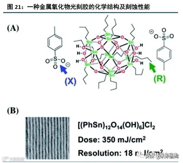减小 LER 可以从以下 4 方面入手:一是增加碱性添加剂;二是在树脂上通过化学键连接光致产酸剂(PAG) ;三是分子玻璃光刻胶;四是基于金属氧化物的光刻胶。上述的 4 个方法中,增加碱性添加剂主要是为了控制酸 的扩散,但是增加碱性添加剂后需要更大的曝光能量,也就是损失了光刻胶的光敏性。将 PAG 键合到树脂上, 可以实现对酸扩散的精确控制,但是大部分的研究只是将阳离子固定在树脂上,曝光后生成的酸是游离的,这 样并没有太大的作用,而将阴离子固定在树脂上,制备过程比较困难。第 3 种和第 4 种方案,也就是分子玻璃 光刻胶的研究与金属氧化物光刻胶是比较有前景的 EUV 光刻胶技术。
