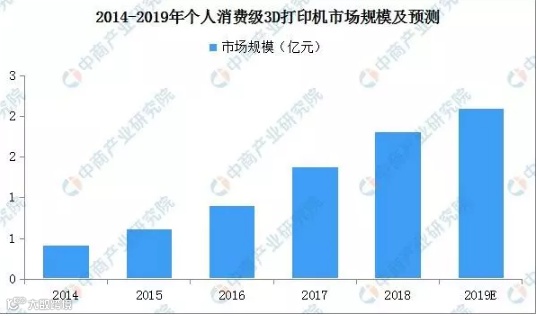 消费级3D打印机虽然在销售收入上的份额不及工业级3D打印机,但却占了相当一部分市场出货量。随着人工智能技术的不断成熟,消费级3D打印机逐渐被人们熟知,吸引了大量企业和消费的关注。据数据显示,2012-2018年消个人费级3D打印机市场规模迅速发展。预计2019年,个人消费级3D打印机市场规模将进一步增长,超2亿元。