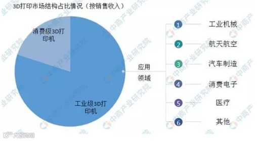 3D打印机主要分为消费级和工业级。工业级3D打印机速度更快、精度更高,在航空航天、汽车制造、医疗等领域广泛应用。目前,工业级3D打印机在国内3D打印市场结构中,从销售收入来看占比远超消费级3D打印机。