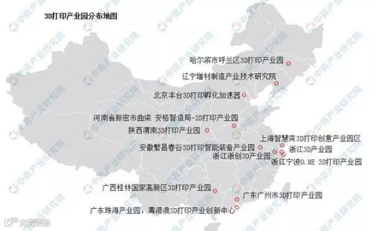 此外,3D打印行业的快速发展离不开政府的支持,在此背景下,3D打印产业园不断涌出。目前,国内3D打印产业园主要分布在沿