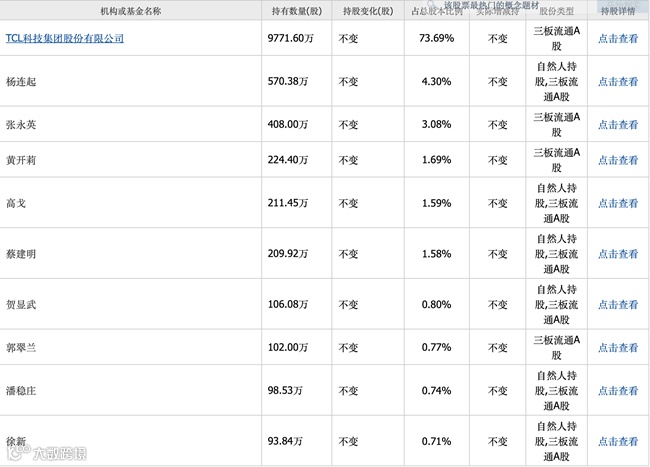 TCL科技集团持有公司占公司股份总额的73.69%,为公司的控股股东。