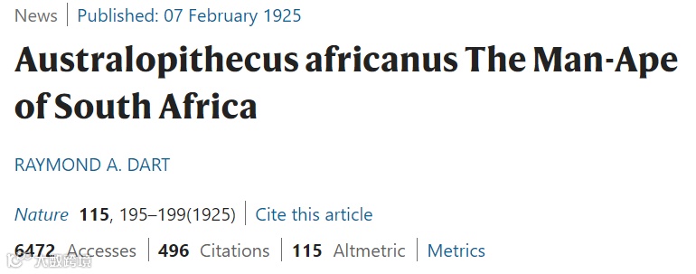 1925年,Nature报道了非洲古猿化石的发现。这一发现彻底改变了关于早期人类进化的观点,人类的祖先猿猴在进化树上开始有了不同的分支。