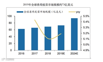 2018年全球兽用疫苗销售规模约69.35亿美元,同比增长5.11%,其中宠物疫苗销售收入约30.5亿美元,同比增长5.28%,占全球兽用疫苗收入比重约44%,预计未来5年全球宠物疫苗销售规模超过56亿美元。