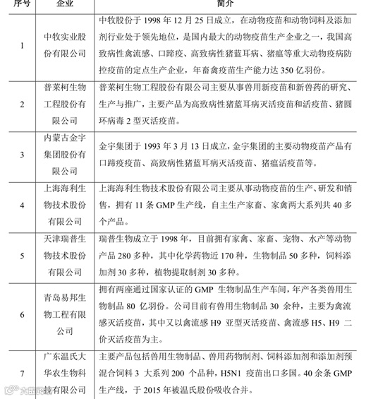 目前有重要影响的全球及地区性动物疫苗厂家还有英特威、富道、梅里亚、辉瑞、诗华、先灵葆雅、拜耳和维克等。