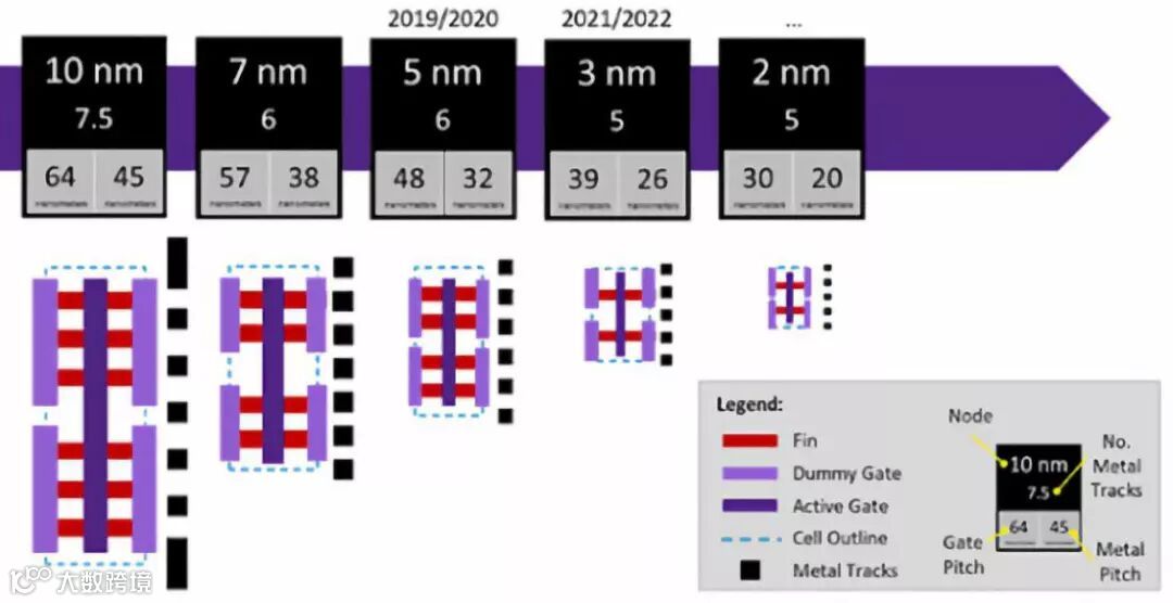 按照台积电给出的指标,2nm工艺是一个重要节点,Metal Track(金属单元高度)和3nm一样维持在5x,同时Gate Pitch(晶体管栅极间距)缩小到30nm,Metal Pitch(金属间距)缩小到20nm,相比于3nm都小了23%。