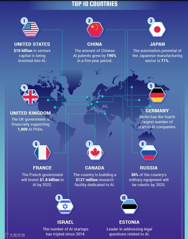 6、法国:到2022年,法国政府对AI行业的投资将达18亿美元。