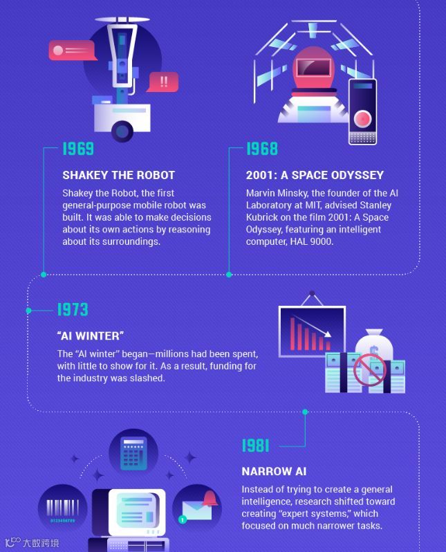 【导读】如果从阿兰·图灵1943年首次提出“图灵机”的概念算起,AI已经经历了86年的发展史。本文以信息图的形式回顾了这70多年的标志性事件,并归纳出AI发展的几个方向和技术应用,以及10大AI企业和国家排行榜。