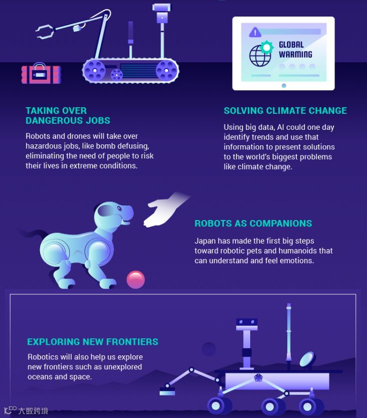 代替人类从事危险职业:机器人和无人机将代替我们完成炸弹拆除等危险任务,我们不必为了完成这些任务冒上生命危险。