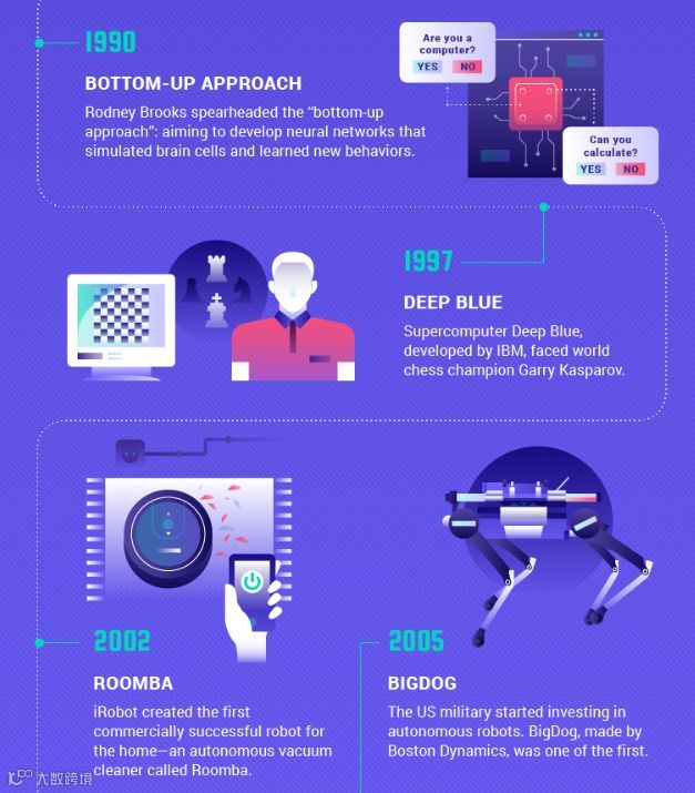 1990年,Rodney Brooks提出了“由下自上”的研究思路,开发能够模拟人脑细胞运作方式的神经网络,并学习新的行为。