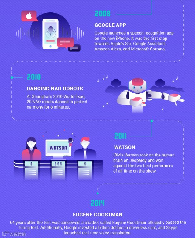 2014年,在图灵测试诞生64年后,一台名为Eugene Goostman的聊天机器人通过了图灵测试。谷歌向自动驾驶技术投入重金,Skype推出实时语音翻译功能。