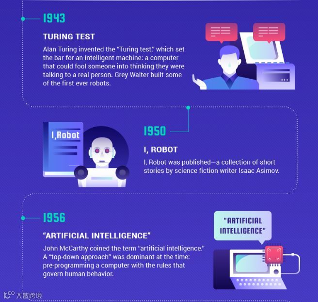 1943年,阿兰·图灵发明了“图灵机“,为智能机器的判定设置了基准:”能够成功骗过人类,让后者以为自己是人类的机器,称为智能机器。”