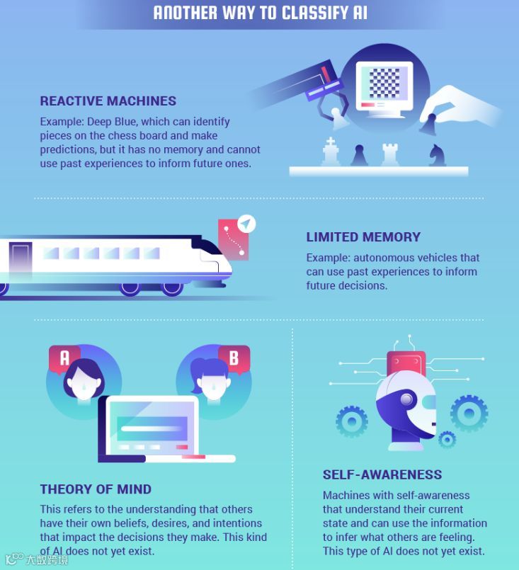 自我意识:具有自我意识的机器,能够理解自身目前的状态,并能利用现有信息推测他人的感觉。目前这类AI也不存在。