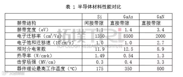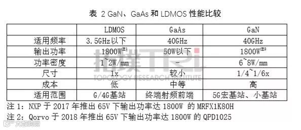 GaN的禁带宽度、电子饱和迁移速度、击穿场强和工作温度远远大于Si和GaAs,具有作为电力电子器件和射频器件的先天优势。GaN器件相比于目前主流技术——GaAs器件和Si基横向扩散金属氧化物半导体器件(LDMOS),具有性能优势。