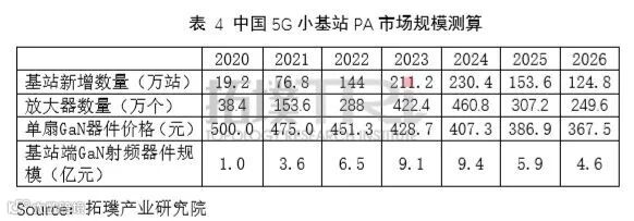 根据表 4 的测算,2024 年小基站端对 GaN 放大器的需求将达到最大规模,为 9.4 亿元,就增速而言,2021 年 YOY 达 260%。