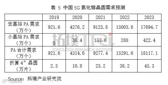 依据拓璞分析,GaN 放大器需求数量在 2019-2023 年保持快速增长,2023 年达 18117 万个,按照 4” GaN 晶圆切 400 个计算,则需要 GaN 晶圆数量达 45 万片。就增速而言,2020 年增速最高,YOY达 369%。