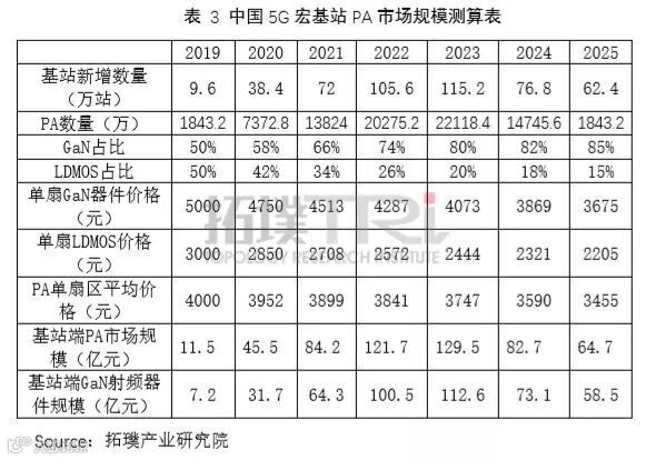 拓璞分析,5G 基站数量方面,中国移动占比超过 50%,前期建设情况下,LDMOS 放大器拥有一定比例的市场,推测 GaN 射频器件约占 50%,预计到 2025 年,GaN 射频器件占比 85%以上。