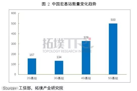 根据工信部数据,截至 2017 年 12 月底,中国 4G 宏基站数量为328 万座,依据蜂窝通信理论计算,中国 5G 宏基站数量约为 500 万座,达 4G 基站数量的 1.5 倍。